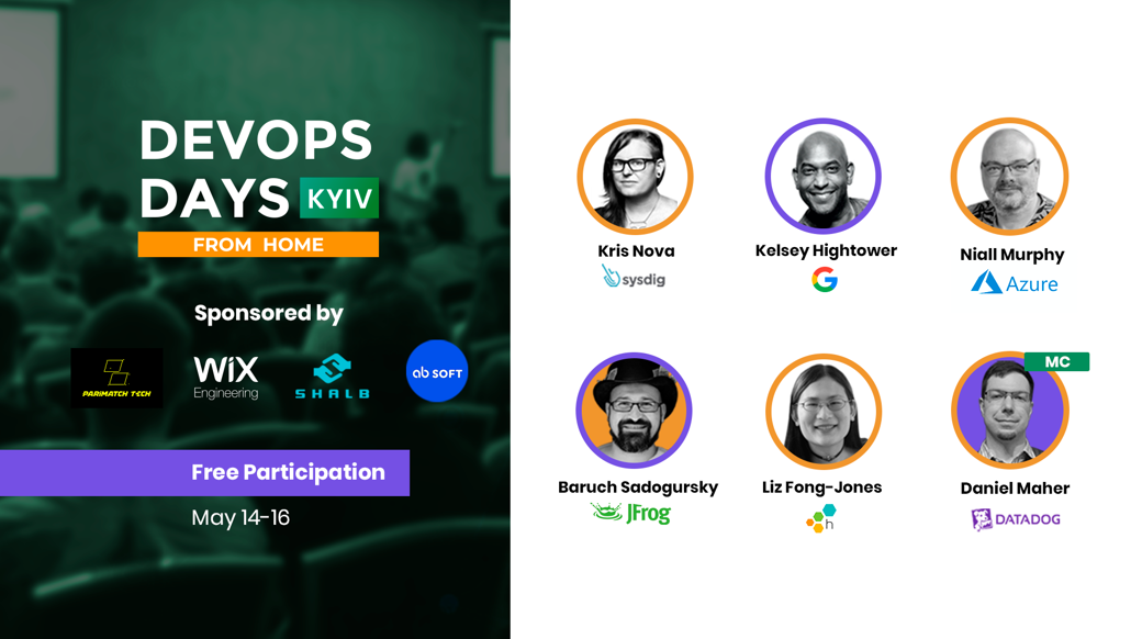 This May we will have three days of online talks and discussions on DevOps Tech & Culture and how to build it.   💣 Top speakers from around the globe: ‎•‎ Kris Nova – Kubernetes pioneer and Chief Open Source Advocate at Sysdig. ‎•‎ Baruch Sadogursky – Developer Advocate at JFrog with 17 years of high-tech experience ‎•‎ Liz Fong-Jones – Principal Developer Advocate for SRE & Observability at honeycomb.io ‎•‎ Niall Murphy – Director of Engineering for Azure Cloud Services at Microsoft ‎•‎ Kelsey Hightower – Staff Developer Advocate at Google   💬 We will run a live fireside chat with Kelsey Hightower. A fireside chat is an informal yet structured interview between a moderator and a guest. It’s a unique opportunity to uncover the speaker’s personal stories and ideas. It also goes by names like “Ask Me Anything” or “A Conversation With…”.   😎 Dedicated Zoom Room, where you can catch up with the community instead of hallway discussions.   When? May 14-16 Where? Online!   Learn more about DevOps Days Kyiv From Home: https://devopsdays.com.ua/fromhome   ⚙️ DevOps Days Kyiv is a community event focused on the DevOps Culture. This conference covering topics of software development, IT infrastructure operations, and the intersection between them.   ✉️ If you would like to become a partner, please, reach us on: kyiv@devopsdays.org