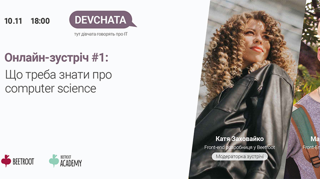The first guest will be Marina Skrypnyk, Front-End developer Beetroot. Marina is from Beetroot Solutions team, which develops turnkey projects. Worked with Ember.js and Angular frameworks, now the basis of its stack - Vue.js and React. She also studies software architecture. Worked on the international adaptation of the front-end course in the framework of cooperation between Beetroot Academy and Pink Programming (educational platform for girls in Sweden), taught modules in Pink Programming with JavaScript and Vue.js. Katya will ask Marina what she needs to know about computer science. And you join the conversation too!