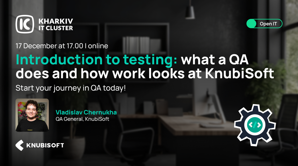 Kharkiv IT Cluster invites you to the final webinar of this semester within the Open IT project, hosted by KnubiSoft, for everyone who wants to understand what QA is, what tasks testers perform, and how their work is organized in an IT company.