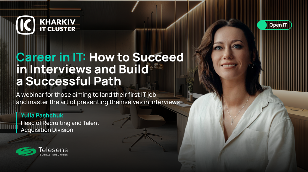 The event is organized by Kharkiv IT Cluster together with Telesens. The speaker will be Yuliia Pashchuk, Head of Recruiting and Talent Acquisition Division at Telesens. With many years of experience in recruitment, she has helped dozens of specialists find their path in the IT industry.