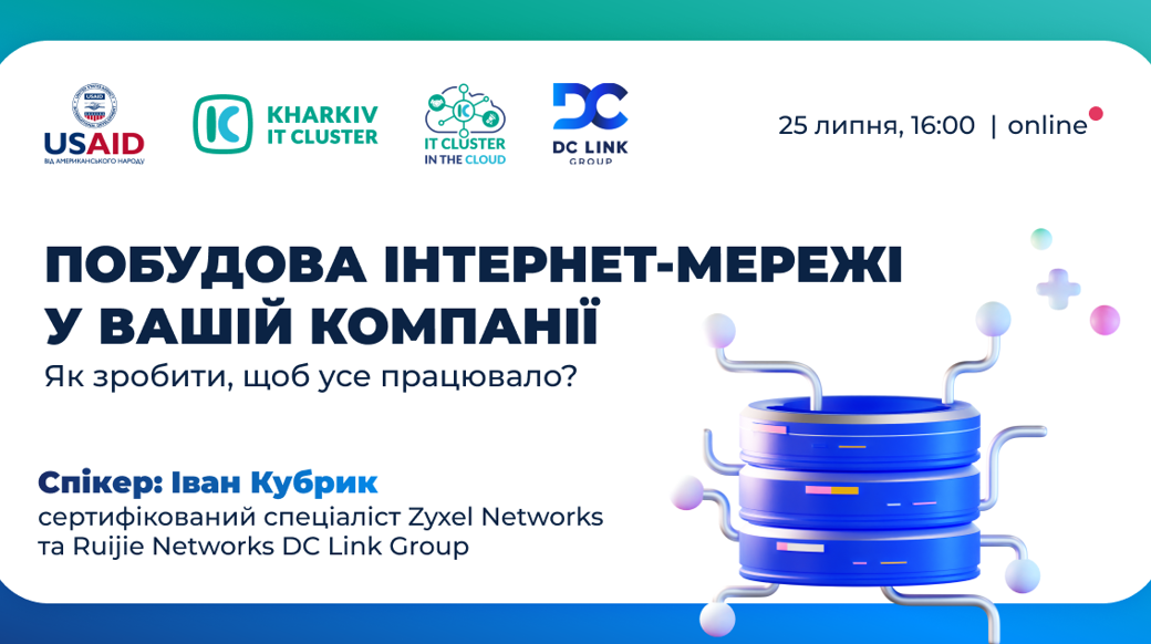 Середні та малі підприємства постійно потерпають від фішингу, зловмисного ПЗ та інших несанкціонованих дій. Як захистити свою мережу, щоб не втратити дані і компанію? — Дізнайтесь на івенті. 🔊 Тема зустрічі: «Побудова інтернет-мережі у вашій компанії. Як зробити, щоб усе працювало?» 🎤 Спікер івенту: Іван Кубрик, Product Manager напрямку Мережеве обладнання національного ІТ Дистриб'ютора компанії DC Link Group, сертифікований експерт з обладнання Ruijie Networks, Zyxel Networks. На зустрічі розглянемо: