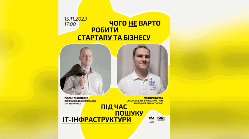 👉 1991 Accelerator запрошує вас на безкоштовну лекцію від спеціалістів SIM-Networks «Чого не варто робити стартапу та бізнесу під час пошуку IT-інфраструктури?»
