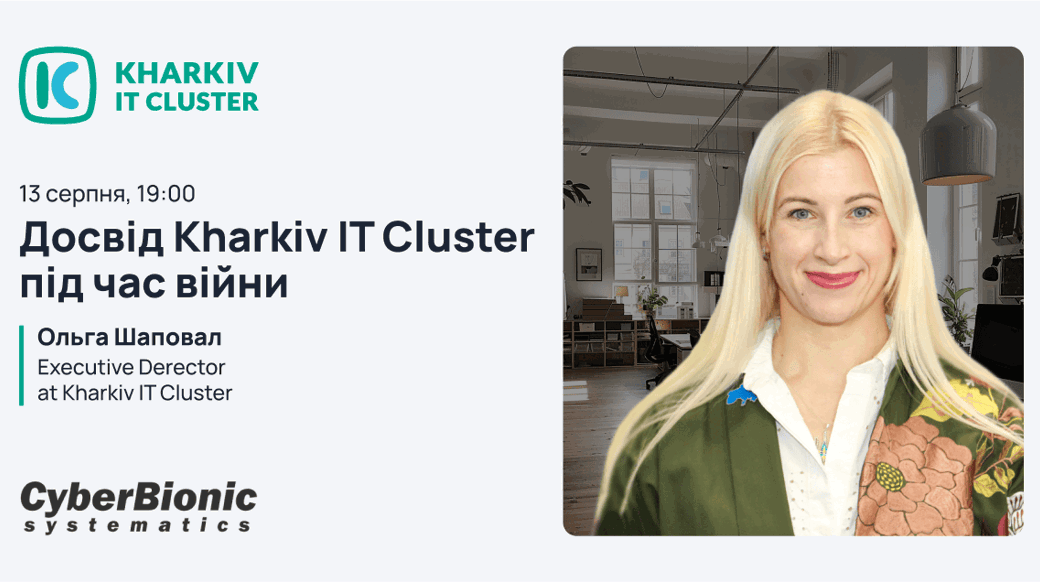 OnlineХочеш дізнатися більше про Харківський ІТ Кластер? З якими викликами стикнулося ком'юніті з початком війни та які плани ми будуємо на майбутнє? CyberBionic Systematics та Kharkiv IT Cluster запрошують на зустріч, де ти дізнаєшся про роботу кластера та перспективи розвитку ІТ-сектору харківського регіону. 🧷 Коли: 13 серпня о 19:00, online. 🧷 Що: інтерв'ю з виконавчою директоркою Kharkiv IT Cluster, Ольгою Шаповал. Що обговоримо: 👉 Вплив війни на ІТ-екосистему Харкова: зміни та виклики для Kharkiv IT Cluster. 👉 Ключові проєкти і особистості: досягнення кластеру. 👉 Трансформація ринку вакансій для ІТ-фахівців: нові тренди та можливості. 👉 Майбутнє ІТ-галузі України: перспективи розвитку і міжнародна співпраця. Інтерв’юер: 🎙 Вікторія Чабан — HR-менеджерка та кар'єрна консультантка навчального центру CyberBionic Systematics. Приєднуйся до події — будь в курсі останніх подій та тенденцій в ІТ. Квиток — за посиланням.