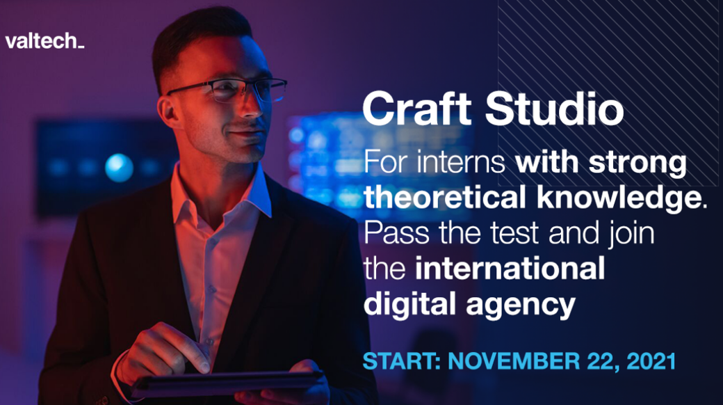 Початок занять — 22 листопада, 2021. Тривалість — 2 місяці повний робочий день з понеділка по п’ятницю. Інтернатура спрямована на швидкий ріст до позиції Junior, і з першого дня інтерни Craft Studio працюватимуть з Valtech на контрактній основі та отримуватимуть компенсацію. Навчання у режимі онлайн, а перший та останній тижні – в одному із наших офісів, щоб познайомитись із командою та відсвяткувати знайомство та випуск Практичний досвід в тестуванні не обов’язковий, але має бути сильна теоретична база. Інтернатура спрямована на практику з нашими досвідченими тренерами, а якісні структуровані знання допоможуть зосередитись на проєктах.Умови вступу: