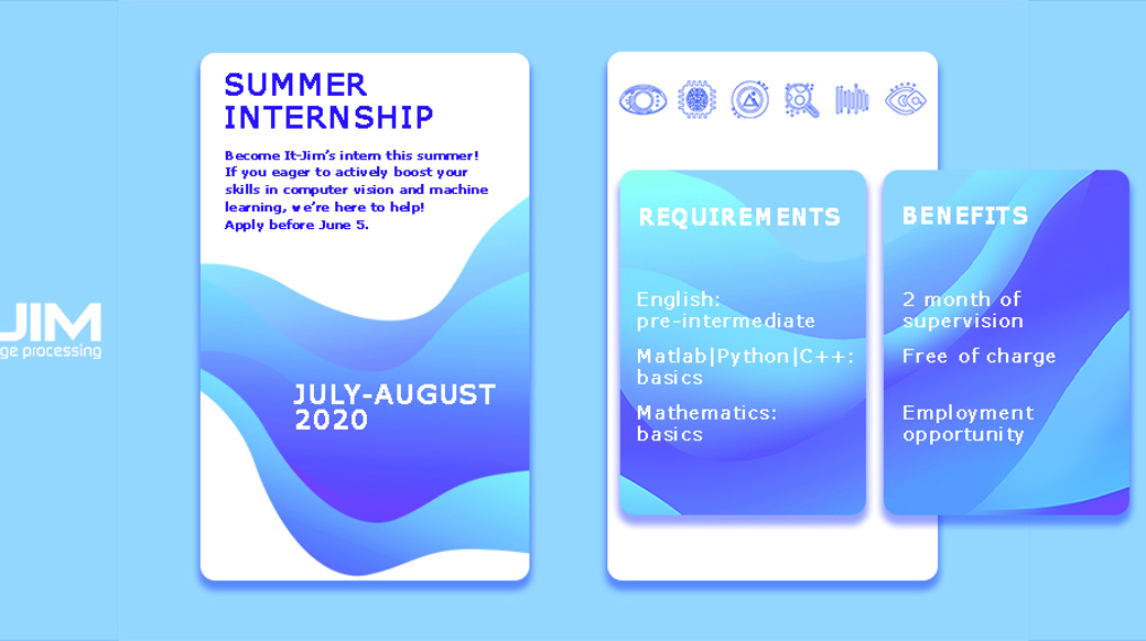 Що вас чекає: 2 місяці, липень і серпень, з щотижневими лекціями з комп'ютерного зору + вирішення практичних CV/ML завдань під керівництвом експертів компанії. В оптимістичному сценарії зустрічі будуть проходити двічі на тиждень в офісі It-Jim. У менш оптимістичному, - два рази на тиждень онлайн. Якщо ви з Харкова, володієте базовими знаннями в області лінійної алгебри і C ++ / Python, рівень володіння англійською мовою у вас pre-intermediate+ і у вас є бажання отримати або підвищити свої навички в області комп'ютерного зору/машинного навчання, welcome!Зацікавлені? Заповніть форму (див. посилання зверху) до 5 червня 2020р. Після відбору і співбесіди ви можете стати інтерном. А згодом - і CV інженером в компанії. Успіхів!