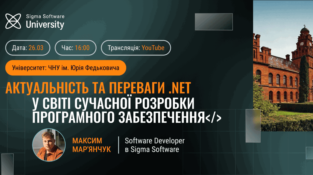 Максим Мар’янчук, Software Developer у Sigma Software, розкриє тему «Актуальність та переваги .NET у світі сучасної розробки програмного забезпечення» в Чернівецькому національному університеті ім. Юрія Федьковича.