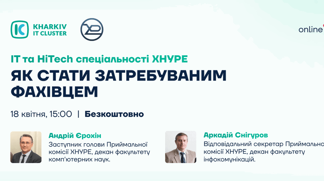 😊 Ти амбіційний і тебе завжди цікавили IT-професії? Мріяв про круту кар’єру й саме зараз обираєш університет, в якому будеш навчатися? То скоріш реєструйся на онлайн-зустріч! 18 квітня Kharkiv IT Cluster та Харківський національний університет радіоелектроніки запрошують абітурієнтів на онлайн-зустріч, де дізнаєшся 👇 : ❓ чому потрібно вступати на навчання у сфері ІТ та HiTech саме в ХНУРЕ; ❓ які умови вступної кампанії 2023 в ХНУРЕ; ❓ які найперспективніші напрями для побудови успішної карʼєри в ІТ та HiTech-сфері; ❓ які кроки необхідні для того, щоб стати затребуваним фахівцем; ❓ бум високих технологій та чи варто обирати HiTech освіту.