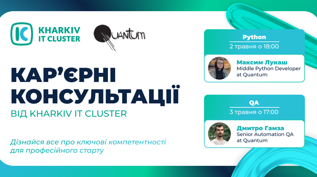 Python: 02 травня, 18:00. Спікер — Максим Лукаш, Middle Python Developer at Quantum, поділиться з тобою інформацією, яку потрібно знати для Trainee/Junior Python Developer. Разом ви розберете матрицю компетентностей, а також розглянете основні концепції мови програмування Python, ключові бібліотеки й інструменти, які часто використовуються в реальних проєктах. QA: 03 травня, 17:00 Спікер — Дмитро Гамза, Senior Automation QA at Quantum, надасть поради щодо побудови успішної кар'єри в галузі QA. Спираючись на вимоги від провідних ІТ-компаній, розглянете основні принципи тестування програмного забезпечення, різні типи тестування й інструменти, які використовуються в тестуванні. Також зосередитесь на питаннях, відповіді на які необхідно знати під час проходження тестувань і співбесід. Не втрачай шанс отримати цінні поради й набути впевненості перед стартом своєї кар'єри. Реєструйся зараз і готуйся до нових викликів і можливостей, які вже чекають на тебе!Зареєструватися на кар'єрні консультації