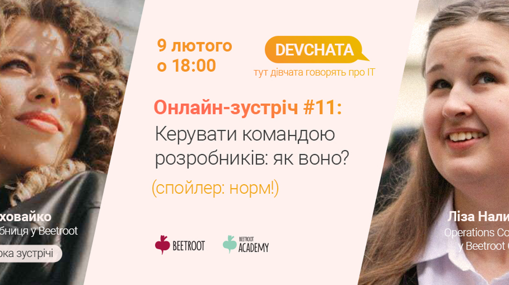 Ліза Наливайко — Operations Coordinator команди з веб-розробки у Beetroot Одеса. Її основні задачі зараз – створювати та розвивати ефективні процеси роботи команди (на хвилинку, в команді більше 50 людей!). До цього була акаунт менеджеркою – опікувалась проєктами та клієнтами. У свій вільний час читає художню та професійну літературу, вивчає французьку і те, як залишатися при здоровому глузді попри все, що відбувається навколо. Модеруватиме зустріч Катя Заховайко — співавторка проєкту DEVCHATA, front-end розробниця у Beetroot, викладачка у Beetroot Academy та засновниця Happy project (happyproject.com.ua) – проєкту, метою якого є робити людей щасливішими, даючи їм знання про саморозвиток, мотивацію, позитивну психологію. Ці зустрічі — це жваві розмови (а не сухі «ефіри»), де Катя постійно слідкує за коментарями та питаннями, адже для нас дійсно важливо почути та обговорити різні думки. Участь безкоштовна. Просто реєструйся і тобі надішлють посилання на зустріч.