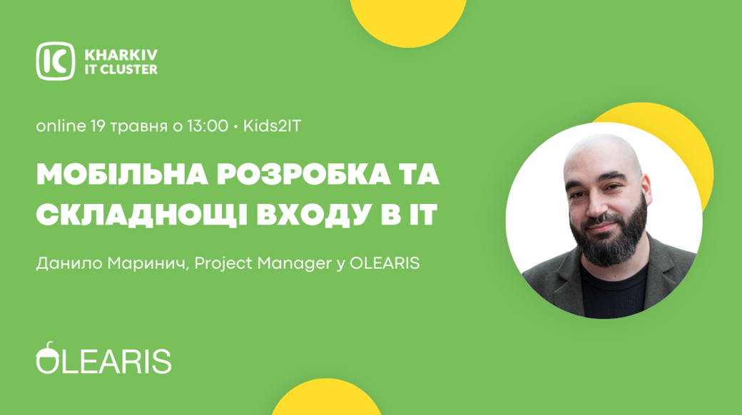 Чув про мобільну розробку, але не зміг розібратися? Саме час познайомитися з нею ближче! Ми знову оголошуємо дату Kids2IT online! Гості нашої зустрічі — команда професіоналів мобільної розробки Olearis. Вже майже 9 років Olearis створює мобільні додатки для різних бізнесів у Європі та США . Данило Маринич, Project Manager компанії Olearis, дуже добре знає про «плюси» роботи в ІТ. Але не думай, що все так веселково. Крім багатьох позитивних моментів в ІТ, початківець може зіштовхнутися і з багатьма складнощами входу до сфери. І щоб вже зараз розуміти, що на тебе може чекати в майбутньому, приходь на зустріч. 19 травня о 13:00 в Zoom