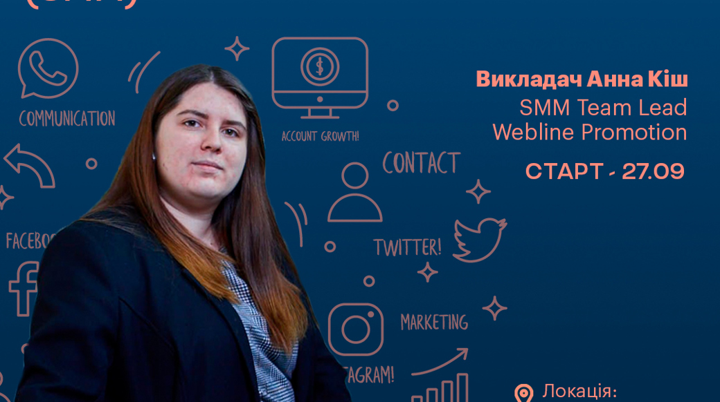 Скільки триває курс? 6 тижнів навчання, 12 занять, 24 години. Який розклад? Понеділок і середа з 19:00 до 21:00. Хто викладач? Анна Кіш - SMM Team Lead у Webline Promotion з більш ніж 4-річним досвідом. Запуск — 27.09 UNIT.City у Харкові Опануй популярну професію вже зараз.