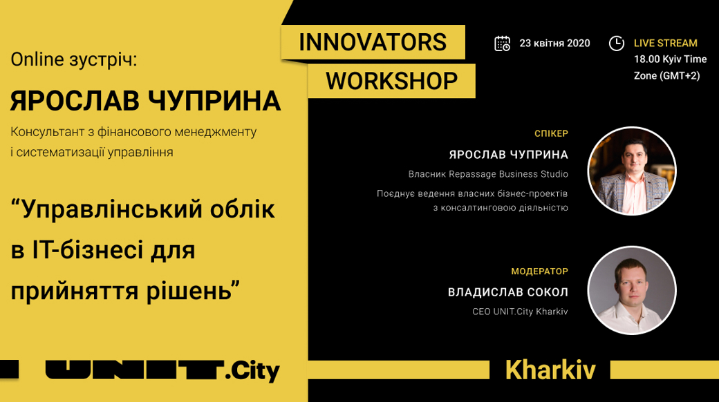 Запрошуємо 23 квітня о 18:00 на INNOVATORS WORKSHOP #2 від UNIT.City Kharkiv у форматі Live Stream: “Управлінський облік в IT бізнесі для прийняття рішень” -  онлайн-зустріч для старших менеджерів і власників компаній. Мета - ознайомити з концепцією управлінського обліку, в якості основи для систематизації менеджменту і зростання бізнесу