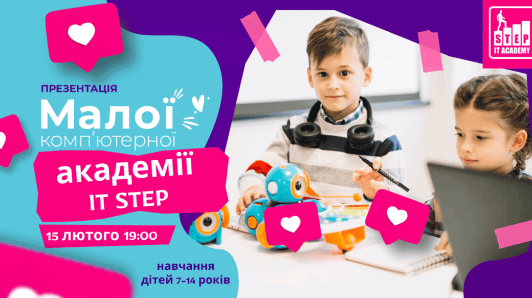 Усі батьки хочуть для своєї дитини найкращого. Найкраще, що ми можемо дати дітям - це освіта і впевненість в своїх силах. Сфера IT - може забезпечити впевненість у майбутньому, а в Малій Комп'ютерної Академії IT STEP діти можуть отримати освіту необхідну для такого майбутнього. Запрошуємо батьків разом з дітьми (7-14 років) побачити все своїми очима на презентації Малої Академії IT STEP 15 лютого о 19:00. У програмі заходу: • Знайомство батьків з керівництвом Академії. • Презентації авторських програм навчання. • Результати випускників МКА IT STEP. • Знайомство з викладачами IT багатоманітне - це роботи, комп'ютерні ігри, цифрова творчість, віртуальна реальність, мультиплікація і блогерство - тобто все те, що люблять сучасні діти. Мала Академія IT STEP для них - це корисна розвага, де можна знайти друзів і весело провести час. Для батьків - це можливість забезпечити гідне оточення для дитини і впевненість в майбутньому. Хіба це не мрія - пишатися тим, як твоя дитина, реалізована в тому, що любить? Переходьте за посиланням та реєструйтесь вже зараз!