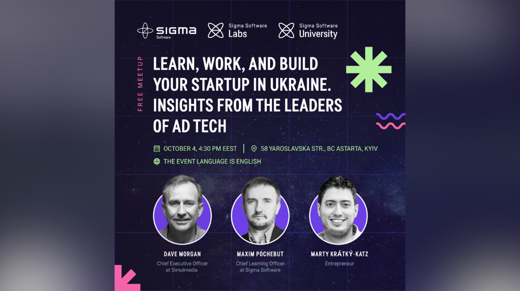 Запрошуємо на зустріч із досвідченими фаундерами стартапів та лідерами технологічної галузі, організовану Sigma Software University разом із Sigma Software Group та Sigma Software Labs.