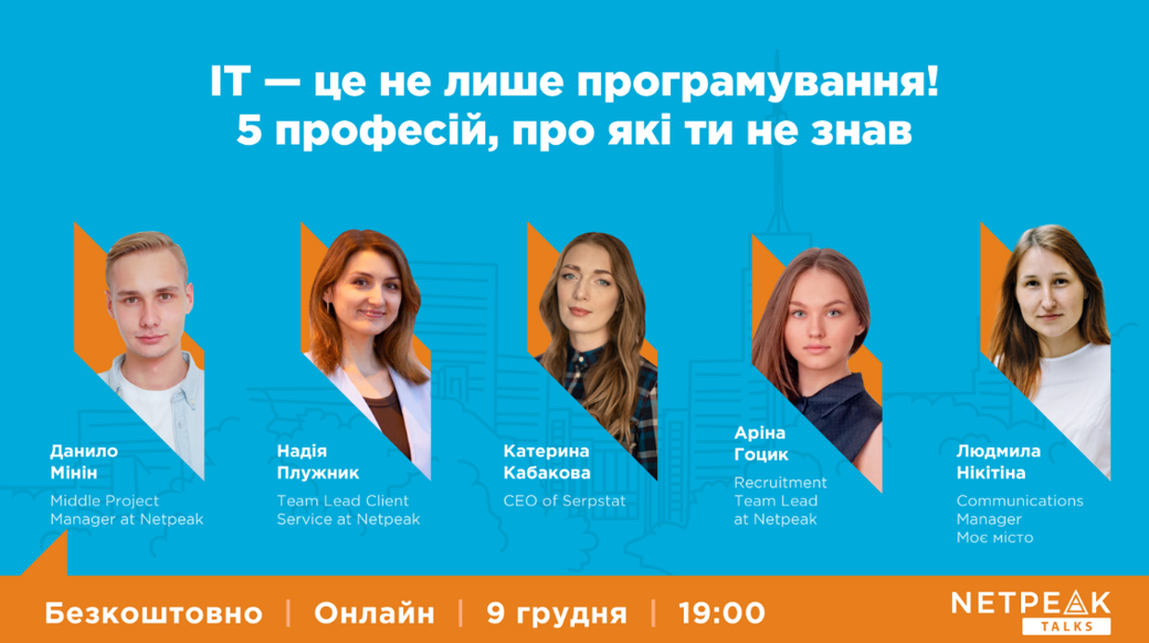 Привіт! Давно не бачилися на Netpeak Talks! Це безкоштовний освітній захід від спеців Netpeak Group. Тут спікери компанії діляться особистим досвідом у сфері IT та Digital. 9 грудня о 19:00 відбудеться онлайн-Talks на тему «IT – це не лише програмування! 5 професій, про які ти не знав». Ви зможете дізнатися про п'ять менеджерських позицій на прикладі реальних кейсів, поспілкуватися зі спікерами та взяти участь у розіграші фірмового мерча. А ще ви переконаєтеся, що поміняти професію можна і без досвіду роботи в IT.