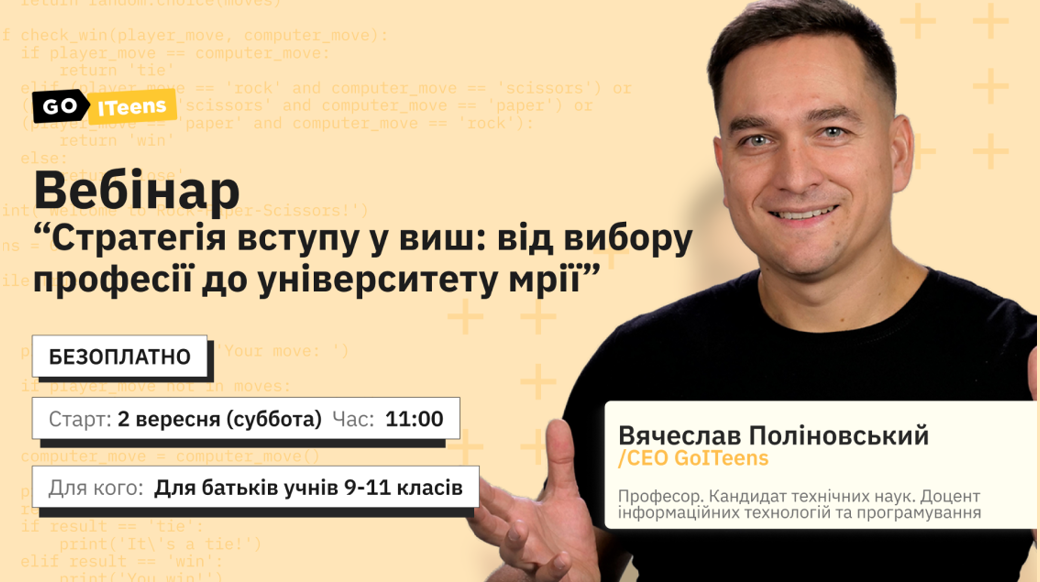 Запрошуємо вас на освітній онлайн вебінар, де СЕО IT-академії GoITeens Вячеслав Поліновський поділиться цінною інформацією для батьків старшокласників. Дізнайтеся, як підготувати міцний фундамент для подальшої освіти на бакалавраті в Україні та Європі. 🗓️ Дата: 2 вересня (субота) 🕚 Час:11:00