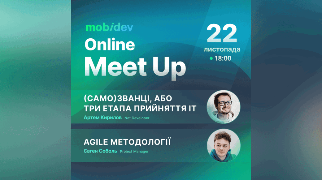 Запрошуємо на безкоштовний Online Meetup від MobiDev! Спікери зустрічі: 🔸Артем Кирилов — .Net Developer в MobiDev. 🔸Євген Соболь — Project Manager в MobiDev. На вас чекають дві доповіді: 🔹«(Само)званці, або Три етапи прийняття ІТ» Дізнаємось, які перепони зустрічає середньостатистична людина у випадку, якщо вона вирішила перейти працювати на ІТ-сферу або ІТ-компанію. Здебільшого фокус буде направлений на особисті фактори, які спричиняють найбільшу перепону у вигляді синдрому Самозванця, а саме — невпевненість, страх, нестача інформації. 🔹«Agile методології» Поговоримо про існуючі Agile методології, які спрощують процес планування та розробки проектів. Дізнаємось як побудувати свій проект, які плюси та мінуси існуючих підходів з планування. Чекаємо на вас 22 листопада о 18:00.