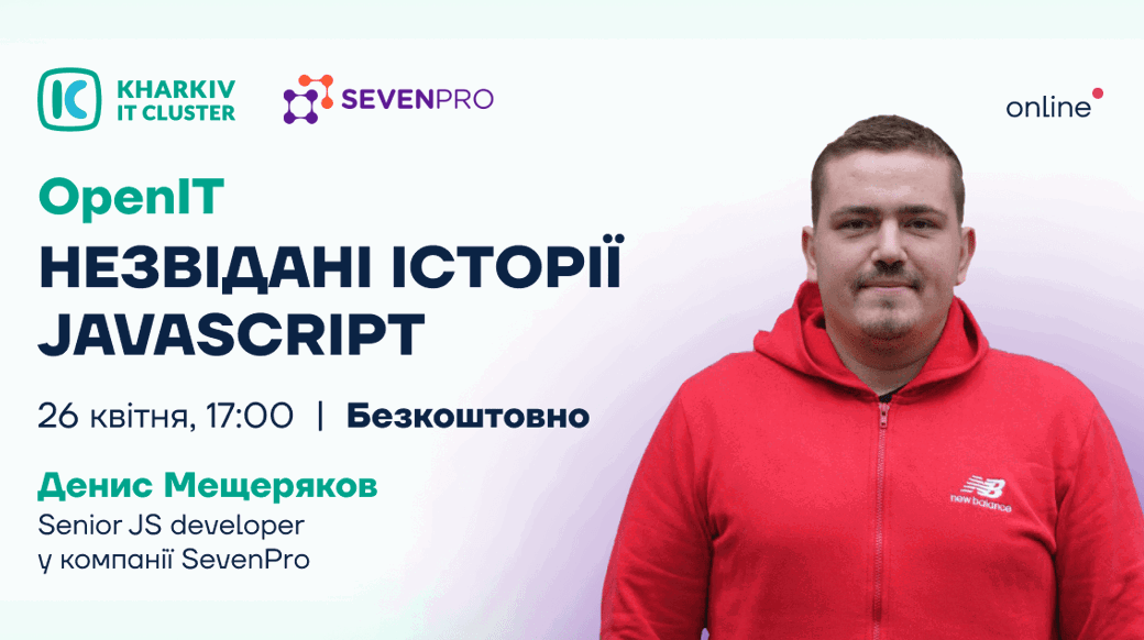 📢 Запрошений спікер — Мещеряков Денис, Senior JS developer у компанії SevenPro, розповість історію створення JavaScript, а також розкриє для учасників зустрічі:
