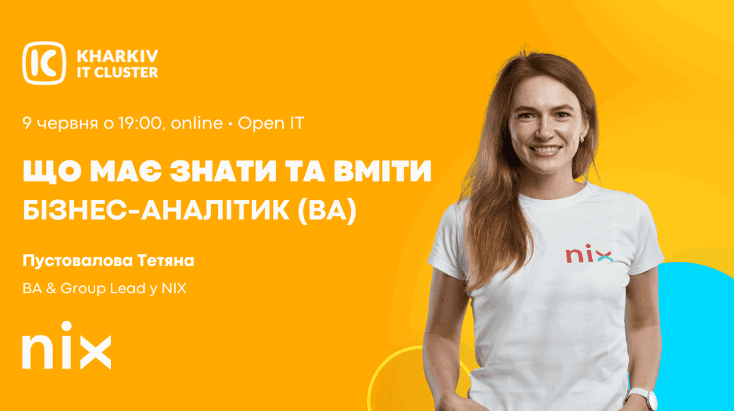 🔥 9 червня о 19:00 Kharkiv IT Cluster разом з Пустоваловою Тетяною, BA & Group Lead у NIX проведемо вебінар на тему "Open IT. Що має знати та вміти бізнес-аналітик (ВА)?"