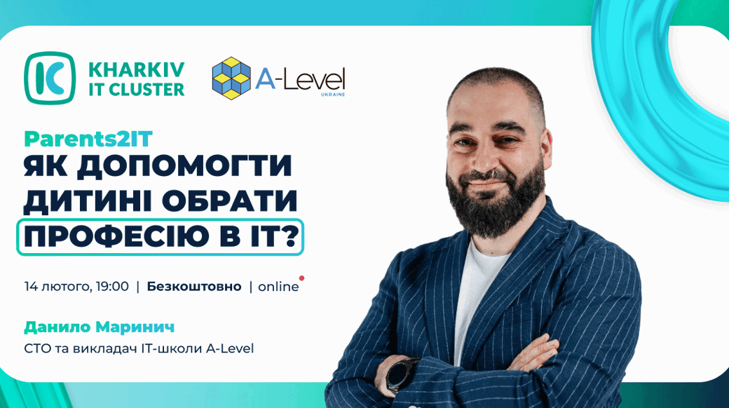 Запрошуємо батьків старшокласників на новий вебінар у межах проєкту Parents2IT від Kharkiv IT Cluster! 14 лютого о 19:00 у форматі онлайн разом із Данилом Мариничем — CTO та викладачем ІТ-школи A-Level ви дізнаєтеся: