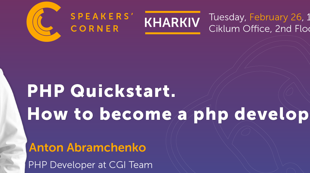 Харківський офіс Ciklum радий продовжити серію заходів "PHP Quickstart". Якщо ви хочете стати PHP девелопером, ми запрошуємо приєднатися до нашої зустрічі, яка пройде 26 лютого о 19.00. Цього разу ми будемо слухати Антона Абрамченка, PHP-розробника в CGI Team.