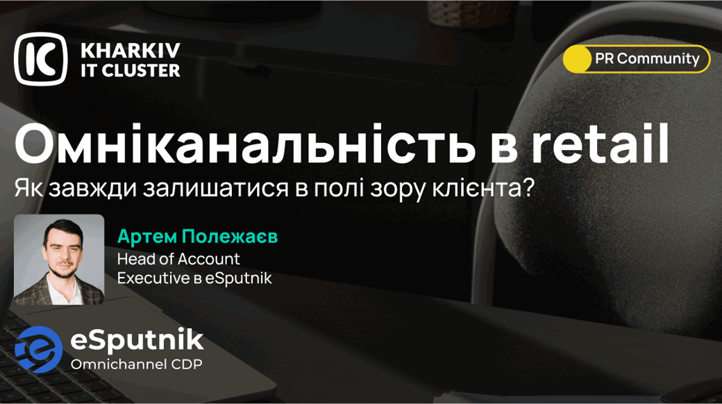 15 жовтня о 16:00 Kharkiv IT Cluster разом із Омніканальною Customer Data Platform eSputnik поділяться, як зробити так, щоб ваш бізнес завжди був у полі зору клієнтів і випереджав конкурентів на ринку. Спікер: Артем Полежаєв — Head of Account Executive в eSputnik, експерт у сфері ecommerce та SaaS рішень для mobile ecommerce, з великим досвідом роботи в активних продажах та діджитал маркетингу.