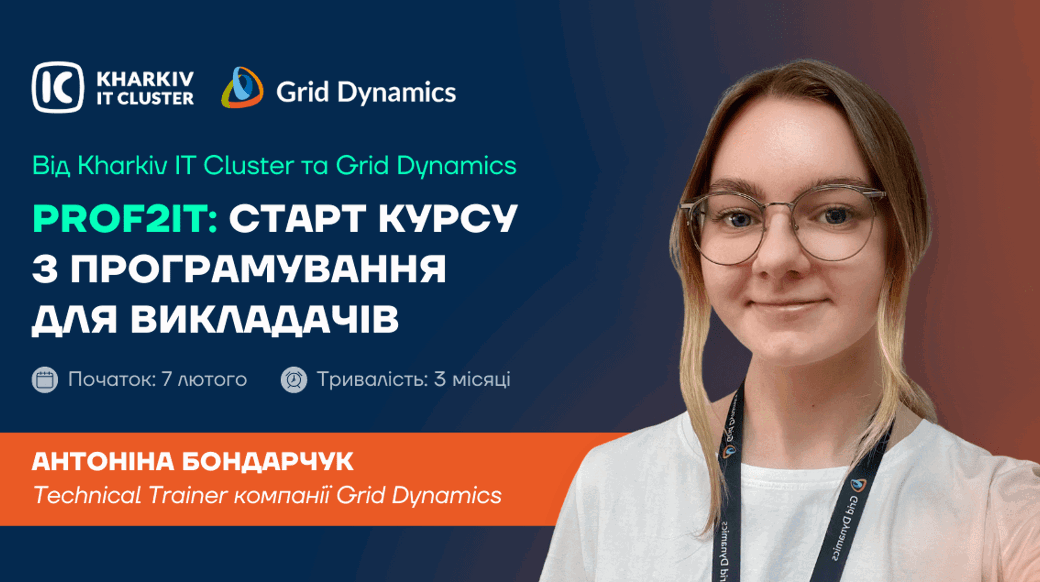 Grid Dynamics — міжнародний лідер у проєктуванні та впровадженні програм цифрової трансформації для компаній з фінансового, технологічного та ритейл-секторів, що входять у список Fortune 500. Компанія має широкий досвід у відбудові складних комерційних рішень. Grid Dynamics веде операційну діяльність з 2006 року, має штаб-квартиру у Каліфорнії та центри розробки у США та Східній Європі. Основні напрямки діяльності — аналітика великих даних, масштабовані кросканальні сервіси, DevOps та підтримка хмарних рішень.Prof2IT: Старт курсу з програмування для викладачів від Grid Dynamics та Kharkiv IT Cluster