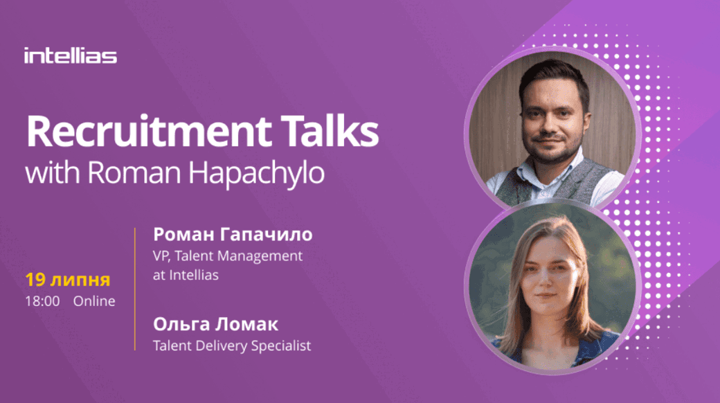 Приєднуйся онлайн до відкритої розмови, з експертами Intellias: Романом Гапачило, VP, Talent Management в Intellias з 16 роками досвіду роботи у сфері ІТ рекрутменту та Олею Ломак, Talent Delivery спеціалісткою Intellias.