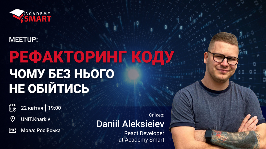 Організатор: Academy Smart Ltd. Вартість: Безкоштовно Формат: Online / Offline Мова: Російська Коли: 22 квітня, 19.00 за Київським часом Де: Unit.KharkivРефакторинг коду: чому без нього не обійтись