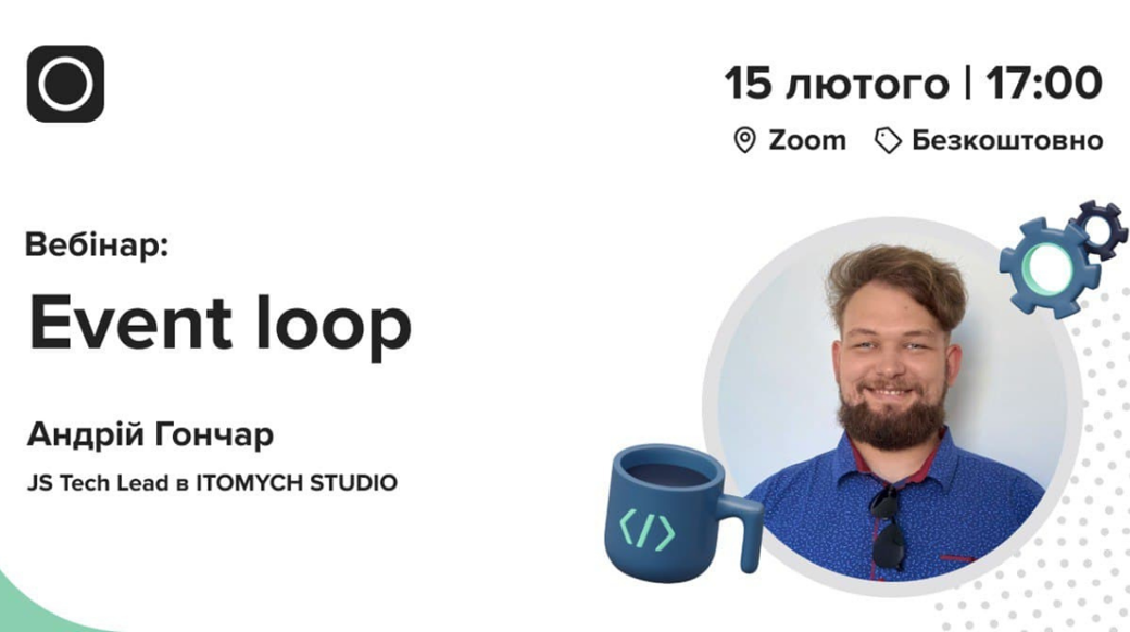 Андрій Гончар — JavaScript Tech Lead в ITOMYCH STUDIO. Його спеціалізація — ReactJS, Redux та TypeScript. Протягом 4 останніх років Андрій щодня працює із кодом на JS: пише, рев’ювить, удосконалює. 15 лютого Андрій проведе вебінар про Event Loop, де розкриє, як працює Call Back, як влаштована асинхронність у JS та як функціонує сам Event Loop.