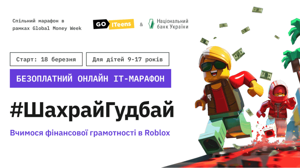 #ШахрайГудбай – безоплатний онлайн ІТ-марафон у метавсесвіті Roblox, де діти дізнаються про основні схеми шахрайства та як захистити свої гроші від крадіїв. Онлайн ІТ-академія для дітей та підлітків GoITeens спільно з Національним Банком України, Ощадбанком та MasterCard допоможе дітям стати фінансово грамотними та дізнатися, як зберегти свої гроші. 📌 Старт події: 18 березня 📌 Для дітей 9-17 років Програма марафону: