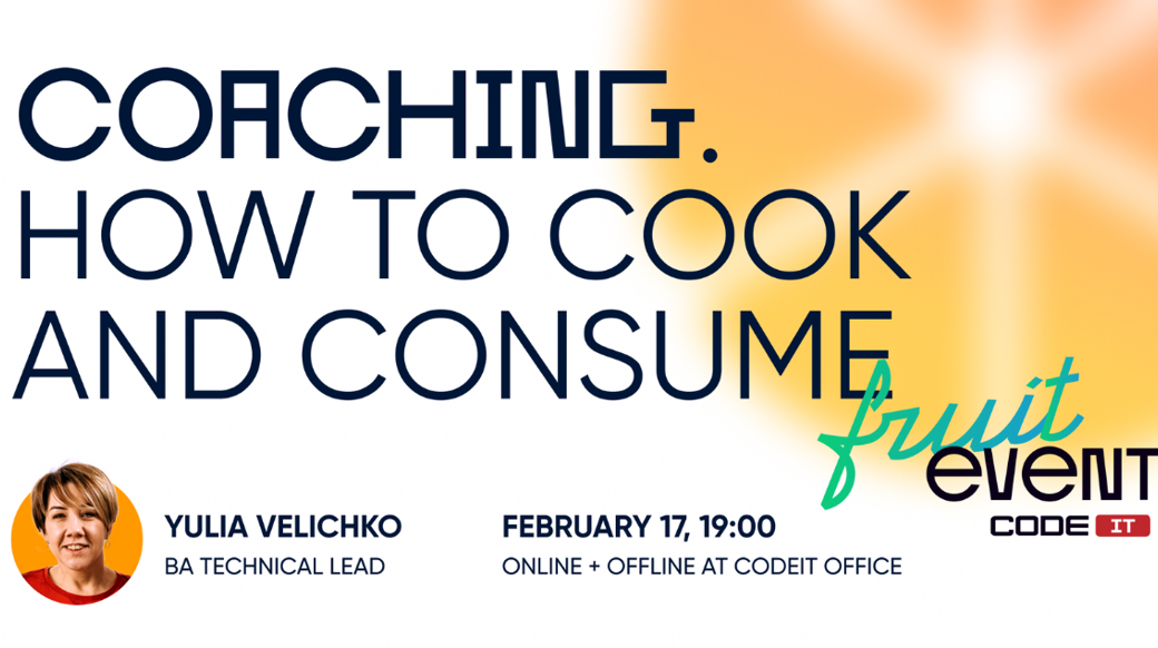 CodeIT Fruit Events — це корисні івенти, в рамках яких досвідчені експерти діляться своїм життєвим досвідом. З кожним івентом "врожай" фруктів зростає, і CodeIT з радістю ділиться ним з більш широкою аудиторією. Спікер — Юлія Величко, Lead Business Analyst в CodeIT Трохи про Юлію: