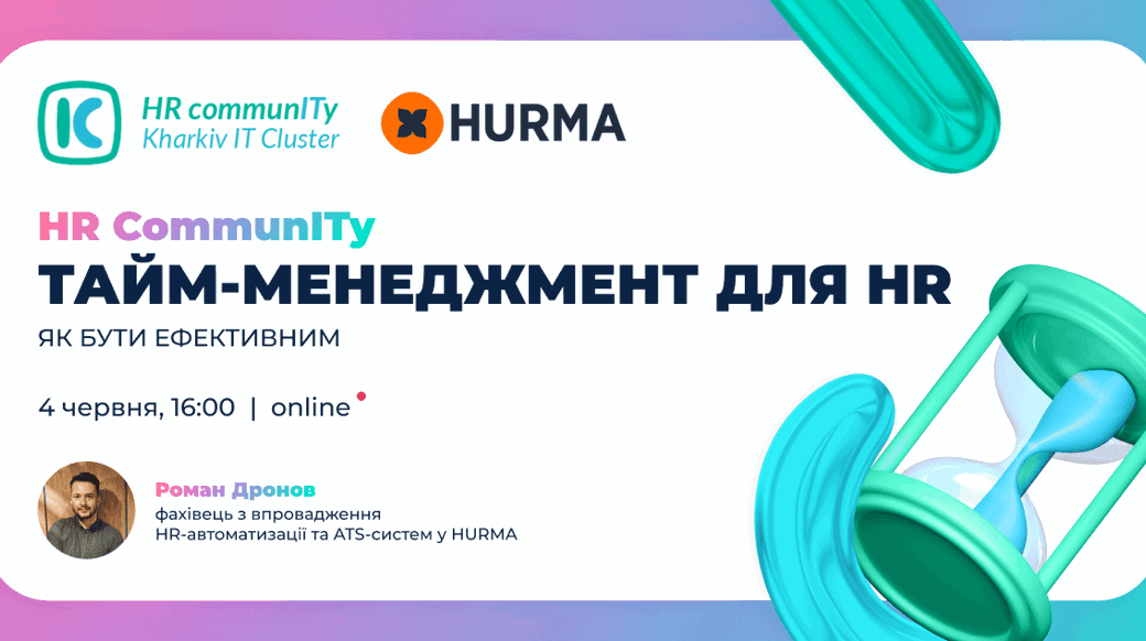 🎯 Хочеш підвищити продуктивність своєї команди за допомогою тайм-менеджменту, але не знаєш, з чого почати? Не плануй нічого на 4 червня, 16:00! Приєднуйся до вебінару «Тайм-менеджмент для HR: як бути ефективним». Поговоримо про: 🔸 Основи тайм-менеджменту, які зроблять роботу ефективнішою. 🔸 Стратегії корпоративного тайм-менеджменту, які працюють. 🔸 Інструменти автоматизації: яке ПЗ обрати? 🔸 Agile, Scrum, Kanban: що краще? Спікер: Роман Дронов — фахівець з впровадження HR-автоматизації та ATS-систем у HURMA. Має 7-річний досвід на позиції HR Process Development Manager. 💰 Вартість участі — 500 грн. Зібрані гроші ми спрямуємо на перезапуск технічної освіти — створення шелтерів в університетах Харкова.#ITCMembers мають знижку 100%, учасники IT Cluster in the Cloud — 15%. Приєднуйся до події — розкривай потенціал своєї команди. Квиток — за посиланням.