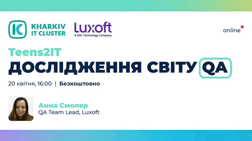 Kharkiv IT CLuster запрошує всіх підлітків, які цікавляться сферою цифрових технологій, на нове інтерв’ю з топовим ІТ-спеціалістом у межах проєкту Teens2IT! На цей раз до  Kharkiv IT Cluster завітає Анна Смоляр — QA Team Lead, Luxoft, для того, щоб розкрити підліткам усі особливості своєї цікавої професії.  ☀️ Що таке QA та чому це важливе розгалуження в ІТ? ☀️ Які існують різновиди QA? ☀️ Чи важливі лідерські якості для роботи в QA? ☀️ Як досягти позиції Team Lead у галузі QA?  ☀️ Як зміни впливають на кар’єрний шлях спеціаліста?  Відповіді на ці питання та багато корисних і мотивуючих порад Анна надасть 20 квітня о 16:00. Окрім цього, серед найуважніших слухачів компанія Luxot розіграє подарунок на згадку! Це інтерв'ю буде особливо цікавим для тих, хто має бажання дізнатися більше про ІТ-світ та його особливості. Не пропусти нагоду дізнатися досвід справжньої професіоналки в галузі QA!