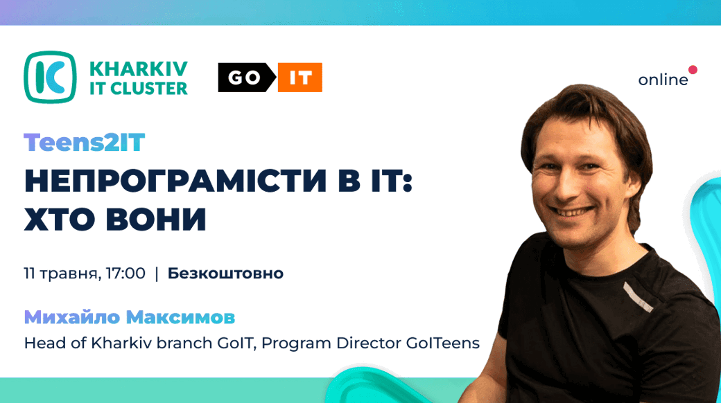 Обрати майбутню професію в підлітковому віці доволі непросто, проте Kharkiv IT Cluster пропонує спростити цей процес у межах проєкту Teens2IT. Інтерв’ю з ТОПовими айтівцями України допомагають розкрити особливості кожної ІТ-професії. Учасники наших зустрічей уже давно знають, що для роботи в ІТ не обов’язково програмувати. Тож, запрошуємо зануритися у світ нетехнічних ІТ-спеціальностей ще глибше! 11 квітня о 17:00 Михайло Максимов — Head of Kharkiv branch GoIT, Program Director GoITeens, розповість про різноманіття нетехнічних ІТ-професій та особливості кожної з них.  Якщо ти давно хотів дізнатися:  ✅ ким можна працювати в ІТ без знань програмування та інжинірингу; ✅ у чому полягає важливість нетехнічних професій в ІТ; ✅наскільки популярні нетехнічні ІТ-фахівці; ✅ як стати нетехнічним спеціалістом в ІТ галузі… … тоді долучайся до нової зустрічі Teens2IT та знаходь відповіді на свої питання!