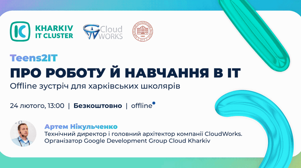 Запрошуємо тебе на офлайн-зустріч із ТОП-овим ІТ-спеціалістом у межах проєкту Teens2IT, яку Kharkiv IT Cluster організовує разом із кафедрами КМАД і Кібербезпеки Національного технічого університету «Харківський політехнічний інститут».