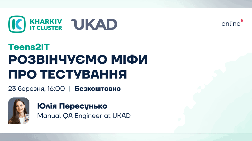 🦸‍♂️ Kharkiv IT Cluster дедалі більше розкриває світ ІТ для підлітків, абітурієнтів та студентів!  На цей раз ми запрошуємо тебе розвінчати міфи про тестування разом із Kharkiv IT Cluster та компанією UKAD! 👉 Тестування — це (НЕ) просто. 👉 Тестування — це (НЕ) нудно. 👉 Тестувальникам (НЕ) потрібно любити математику й комп'ютери. 👉 Тестування — це (НЕ) найлегший спосіб увійти до ІТ. 👉 Через автоматизацію мануальне тестування (НЕ) занепадає. 📣 23.03 о 16:00 Юлія Пересунько — Manual QA Engineer у компанії UKAD, розповість, що з цього переліку правда, а що є міфом.  Окрім цього Юлія розкаже про особливості професії тестувальника, інструменти, з якими вона працює, та поділиться секретом, що допоможе тобі розпочати кар'єру в QA 🤫 Долучайся до зустрічі та дізнавайся багато цікавого й корисного!  Участь безкоштовна за попередньої реєстрації!