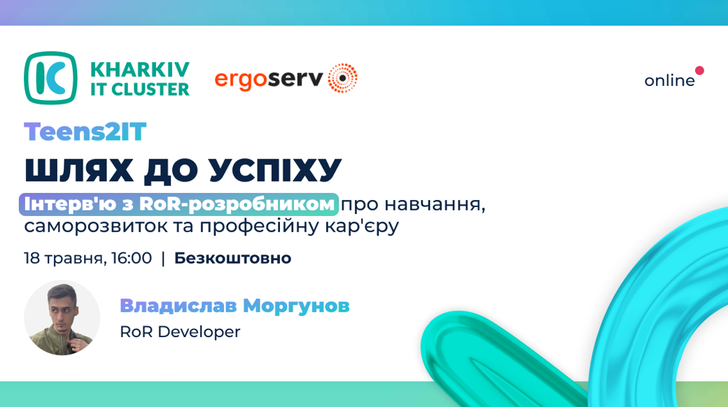 Міфи й стереотипи про неймовірну складність побудови кар’єри в ІТ-галузі заполоняють інфопростір.  Kharkiv IT Cluster укотре їх руйнує на інтерв’ю з ТОПовими айтівцями України в межах проєкту Teens2IT!  18 травня о 16:00 до Kharkiv IT Cluster завітає Владислав Моргунов — RoR-Developer у компанії ErgoServ, для того, щоб поділитися із підлітками історією побудови свого кар’єрного шляху в ІТ та особливостями своєї професії. Ruby on Rails (RoR) — це відкрите програмне забезпечення для розробки вебдодатків з використанням мови програмування Ruby. Більш детально про те: