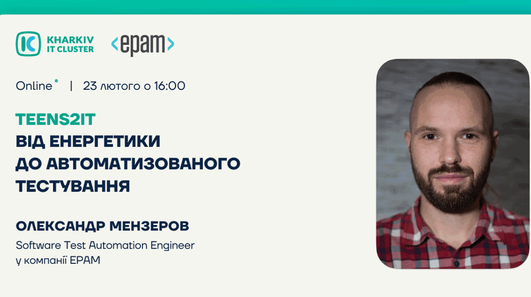 Kharkiv IT Cluster надихається знайомствами з різноплановими  працівниками ІТ-компаній через їхній багатий досвід та неймовірне прагнення до розвитку. У рамках проєкту Teens2IT Харківський ІТ Кластер пропонує школярам та студентам також познайомитися з цими фахівцями та почерпнути для себе багато натхнення й корисних порад, які допоможуть на початку кар'єрного шляху.  Уже 23.02 о 16:00 запрошуємо всіх охочих пізнати ІТ-галузь на інтерв'ю з енергійним та позитивним Олександром Мензеровим — Software Test Automation Engineer у компанії EPAM. Програмування та сфера ІТ вабили Олександра давно, проте своє місце в ІТ він знайшов не одразу. Попрацювавши не один рік  інженерним проєктувальником у царині енергетики, пройшовши різноманітні ІТ-курси, наш спікер врешті-решт знайшов свою реалізацію у сфері автоматизованого тестування.  Тож, якщо ти хочеш дізнатися: