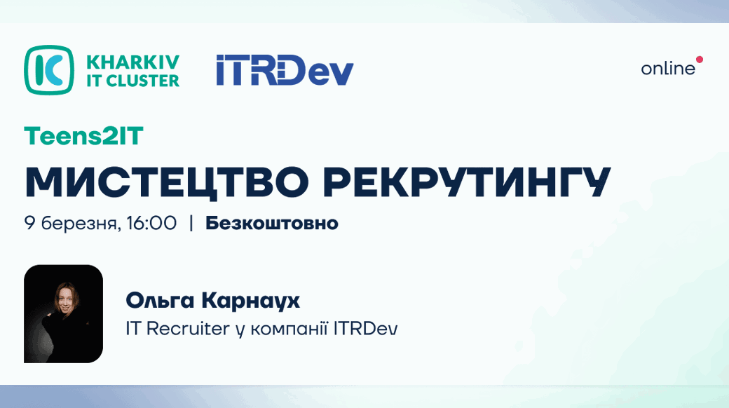 9 березня о 16:00 Ольга Карнаух — рекрутер компанії ITRDev розповість усе про мистецтво рекрутингу, особливості й різновиди  напряму й обов'язки спеціалістів-рекрутерів в ІТ-компаніях.