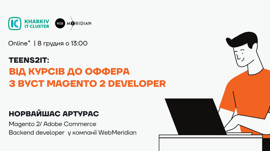 Школярі й студенти, не проґавте можливості дізнатися про одну з найпопулярніших професій в ІТ! 😉 Що це за професія?  Magento 2/ Adobe Commerce Backend developer! ⭐️ Що таке E-commerce? ⭐️ Чим займається  Magento 2/ Adobe Commerce Backend developer? ⭐️ Над якими проєктами зазвичай працюють такі розробники? ⭐️ Якими навичками потрібно володіти , щоб стати Magento розробником?  ⭐️ Як почати свій шлях в ІТ від курсів до оффера? ⭐️ Як знайти свою першу роботу в ІТ? На всі ці питання 08.12 о 13:00 дасть відповіді крутий спікер — Норвайшас Артурас — Magento 2/ Adobe Commerce Backend developer  у компанії WebMeridian 🗣 Спікер має  багатий досвід, а тому точно розповість багато цікавинок. Наша порада не зволікати і попіклуватися про своє майбутнє вже зараз 😎  Тож, якщо хочеш дізнатися про перспективну професію на динамічному ринку ІТ з гнучкістю й можливістю постійно зростати та навчатися, чекаємо тебе на зустрічі! 🤩 Реєструйся на зустріч, буде цікаво!👐 🙌 Участь безкоштовна за попередньої реєстрації! 👉 Коли? 08.12 (четвер) о 13:00 👉 Де? Online, Zoom 👀Реєстрація за посиланням!