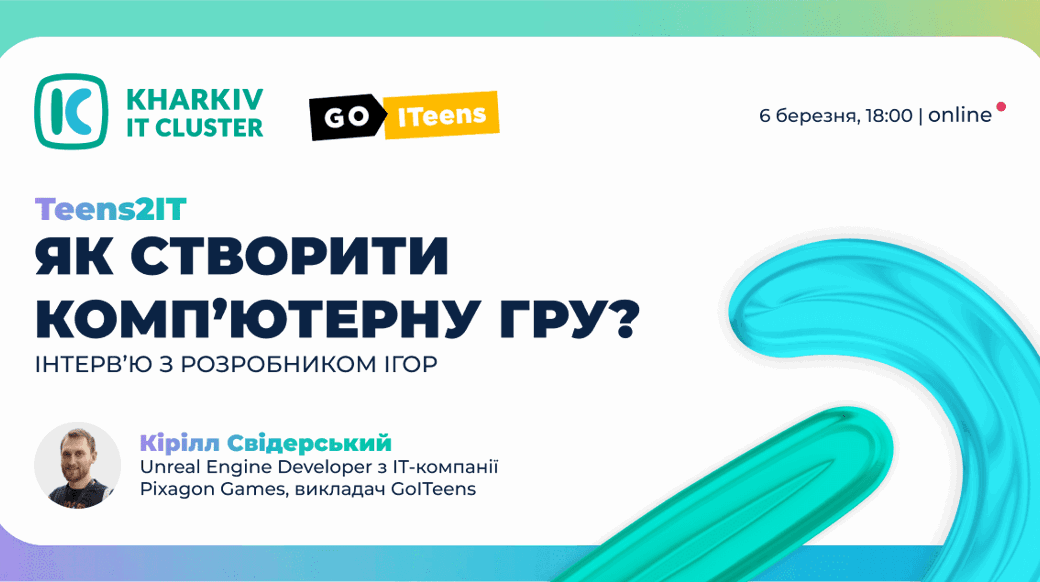 Захоплюєшся комп’ютерними іграми й уже навіть придумав сюжет для власної?  Час втілювати в життя амбітні плани!  Kharkiv IT Cluster запрошує школярів і студентів коледжів долучитися до інтерв’ю з Game developer’ом у межах наступної зустрічі проєкту Teens2IT.