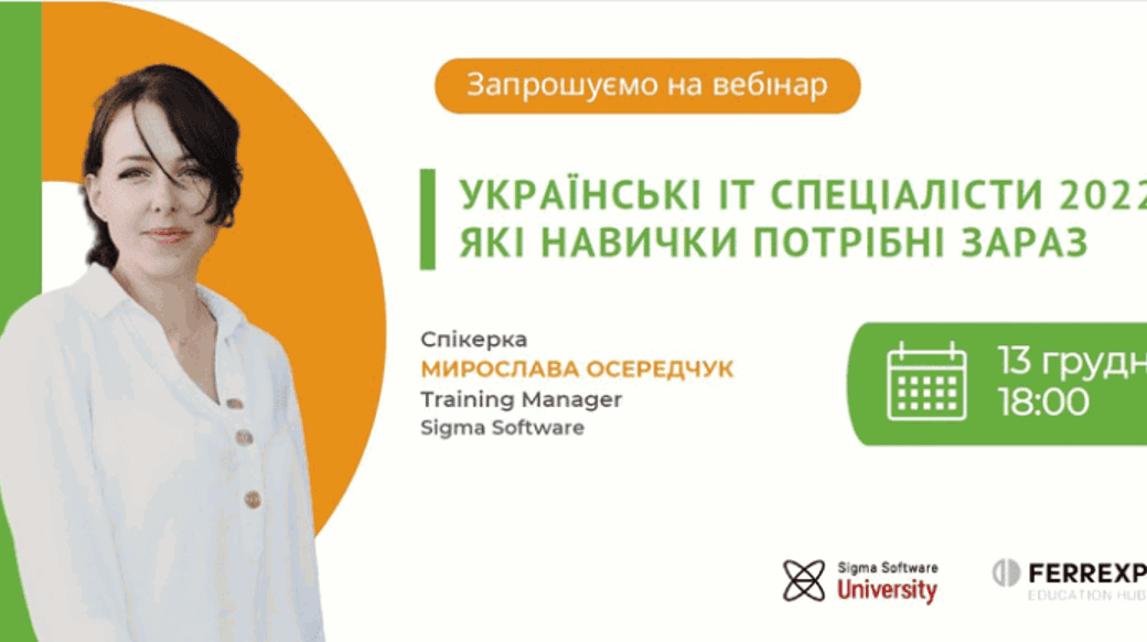 Що потрібно вміти для успішного старту в IT? Відповідь знає Мирослава Осередчук, Training Manager в Sigma Software. Спікерка вже 12 років у освітній сфері, а зараз розвиває освітній напрям компанії на Заході України. Якщо і ти хочеш дізнатися: 🔸 хто такий ІТ фахівець: характерні риси та вподобання; 🔸 як війна вплинула на IT фахівців: територія, заробітна плата, мови програмування та позиції 🔸 навички та кваліфікації - must have для сучасного ІТ фахівця; 🔸 на що слід звернути увагу саме зараз для успішного старту в ІТ; 🔸 можливості для початківців від Sigma Software University. ...тоді приходь на безкоштовний вебінар «Українські ІТ спеціалісти 2022: які навички потрібні зараз» від Ferrexpo Education Hub та Sigma Software University. 📌 Коли: 13 грудня о 18:00