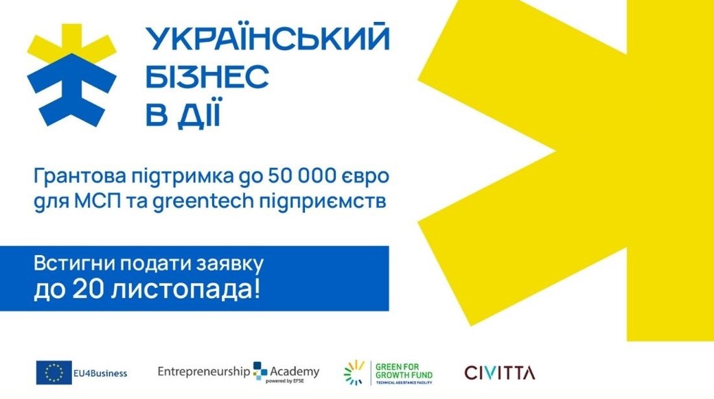 «Український Бізнес в Дії» — це проєкт грантової підтримки малих та середніх підприємств (МСП) та greentech підприємств, що реалізується Програмою розвитку Європейського фонду для Південно-Східної Європи (EFSE DF) та Програмою технічної допомоги Зеленого фонду для зростання (GGF TAF) та міжнародною консалтинговою компанією CIVITTA. Проєкт здійснюється за фінансової підтримки Європейського Союзу в рамках ініціативи EU4Business.