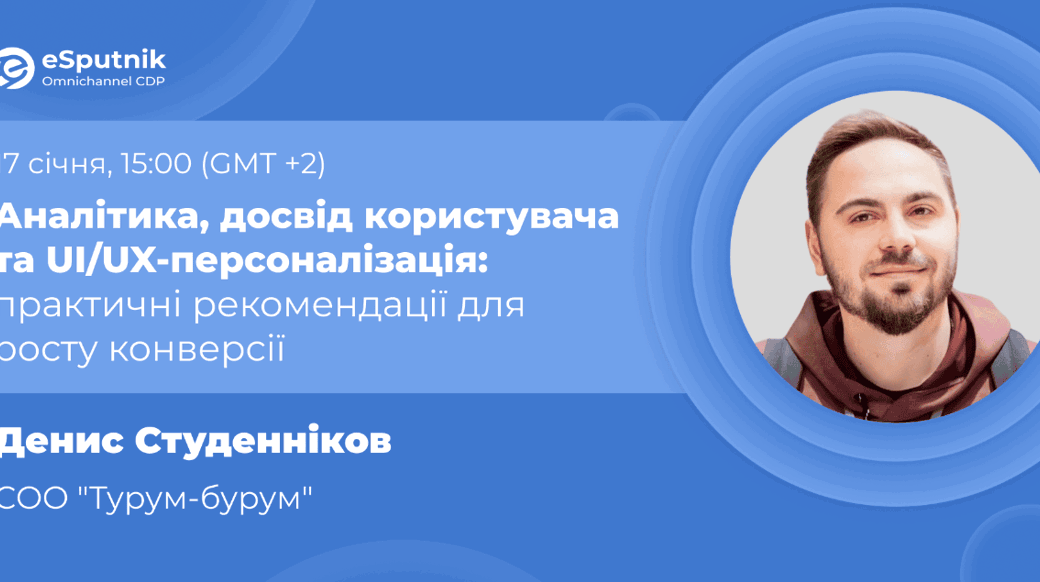 Запрошуємо на відкритий вебінар від омніканальної CDP eSputnik на тему: «Аналітика, досвід користувача та UI/UX-персоналізація: практичні рекомендації для росту конверсії». 📅 17 січня | 15:00 (GMT+2) Спікер: Денис Студенніков, COO «Турум-бурум», 8 років досвіду в UX\UI\CRO. Працював із COMFY, Intertop, «ТехноЇжак», Thule, Samsung Спеціалізується на покращенні показників digital-проєктів за допомогою змін у інтерфейсі. Про що поговоримо: