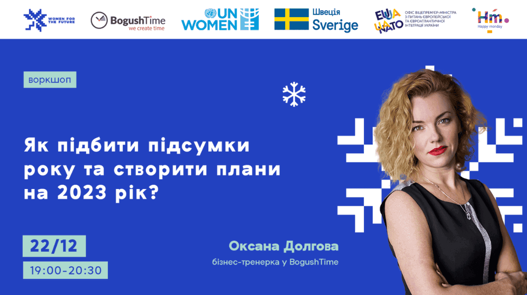 Аби допомогти розібратися з цими питаннями, Happy Monday та ООН Жінки в Україні у співпраці з Офісом Віцепрем’єр-міністерки з питань європейської та євроатлантичної інтеграції в межах проєкту “Women For The Future” проведуть безкоштовний воркшоп «Як підбити підсумки року та створити плани на 2023 рік?» від партнерів, студії управління часом BogushTime.