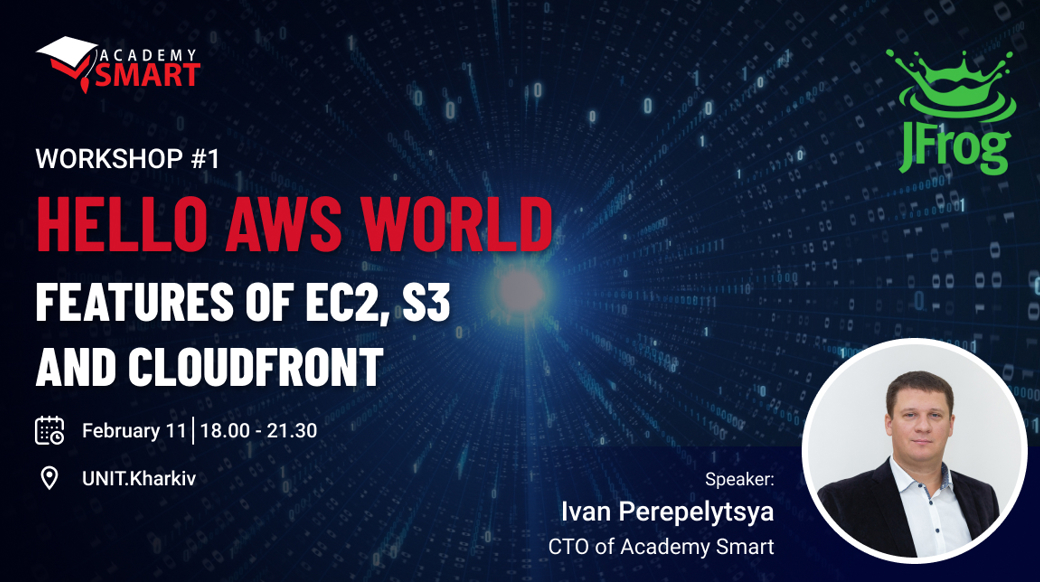 19.30 - 19.45 - перерва на каву 19.45 - 20.15 Практична частина: Застосування сервісів S3, EC2, CloudFront - CDN на основі JFrog Artifactory 20.15 - 20.45 Заключний блок: Підведення підсумків, відповіді на питання 20.45 - 21.30 Networking з канапешками та напоямиДЛЯ КОГО: