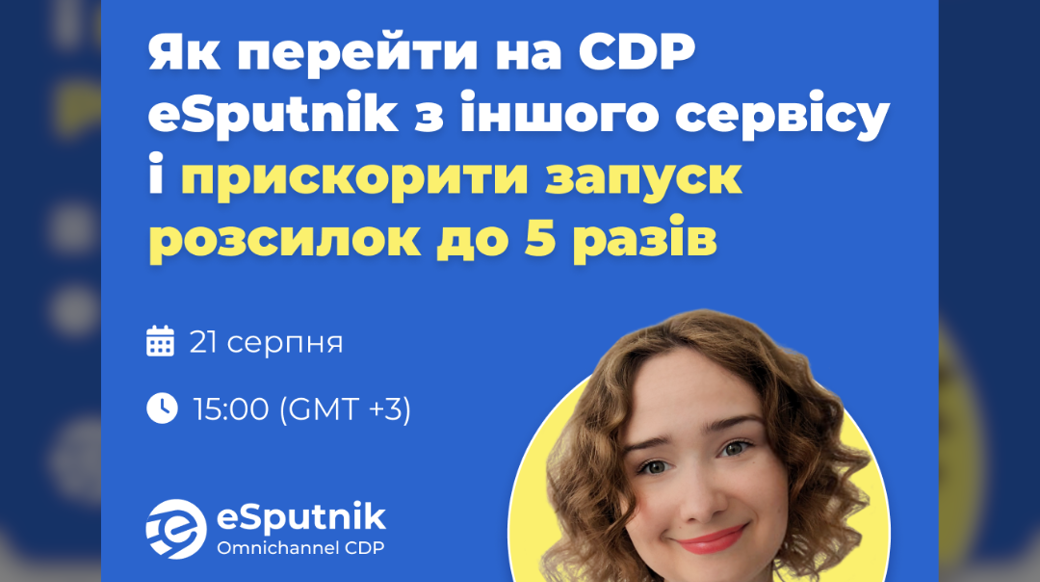 Приєднуйтеся до регулярних вебінарів на маркетингові теми від омніканальної CDP eSputnik 📅 21 серпня | 15:00 (GMT+3) відбудеться зустріч на тему: Як перейти на CDP eSputnik з іншого сервісу і прискорити запуск розсилок до 5 разів. Спікер: Світлана Клименко, direct-маркетологиня у BUKI. Працює у маркетингу 5 років. Має досвід з різноманітними проєктами: від складних B2B та B2G до маркетплейса репетиторів.