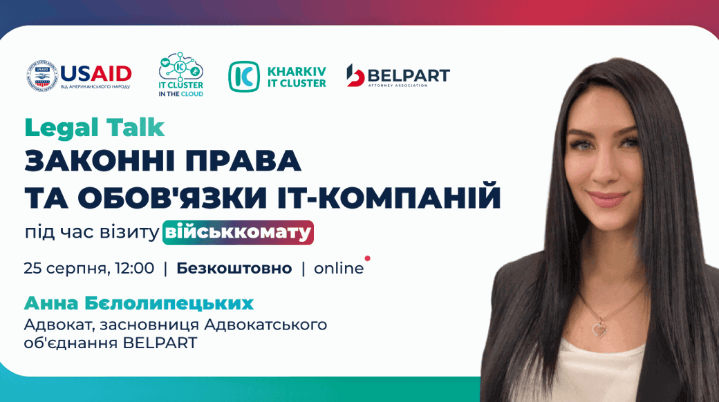 🗓 25 серпня о 12:00 відбудеться Legal Talk, де ми поговоримо на тему «Законні права та обов'язки ІТ-компаній під час візиту військкомату».