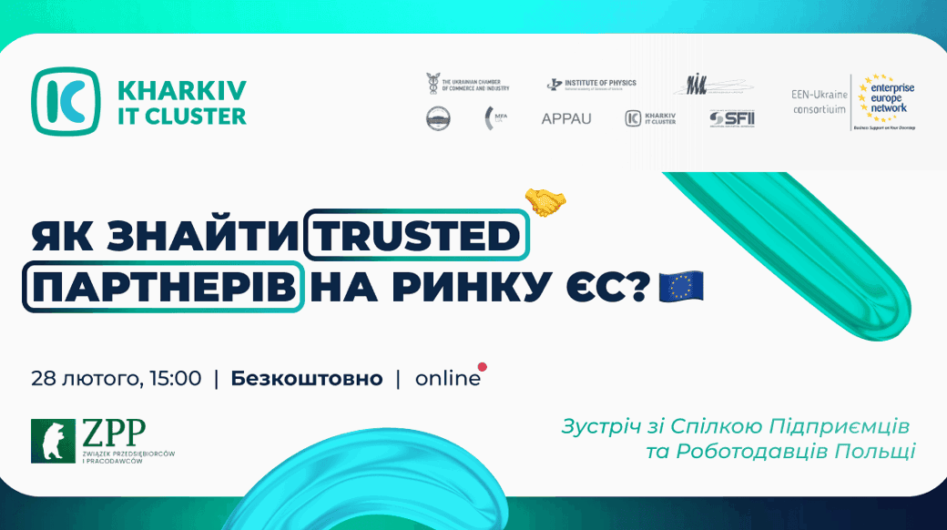📌 механізми для створення метчмейкінгу із клієнтами та партнерами Польщі та ЄС; 📌 доступ до бази бізнес-інсайтів з ведення бізнесу в Польщі, рапортів та аналітики; 📌 перелік проєктів підтримки українського ІТ-бізнесу та стартапів з боку польської держави, зокрема, інвестиційні, грантові та податкових пільг; 📌 перелік профільних заходів на міжнародних майданчиках, вимоги до участі та спецумови. 🔗 Посилання на реєстрацію шукайте в закритих каналах Kharkiv IT Cluster. Зустріч реалізується Kharkiv IT Cluster за підтримки консорціуму EEN — найбільшої у світі мережі підтримки малих та середніх компаній з міжнародними амбіціями.Як знайти trusted партнерів на ринку ЄС?